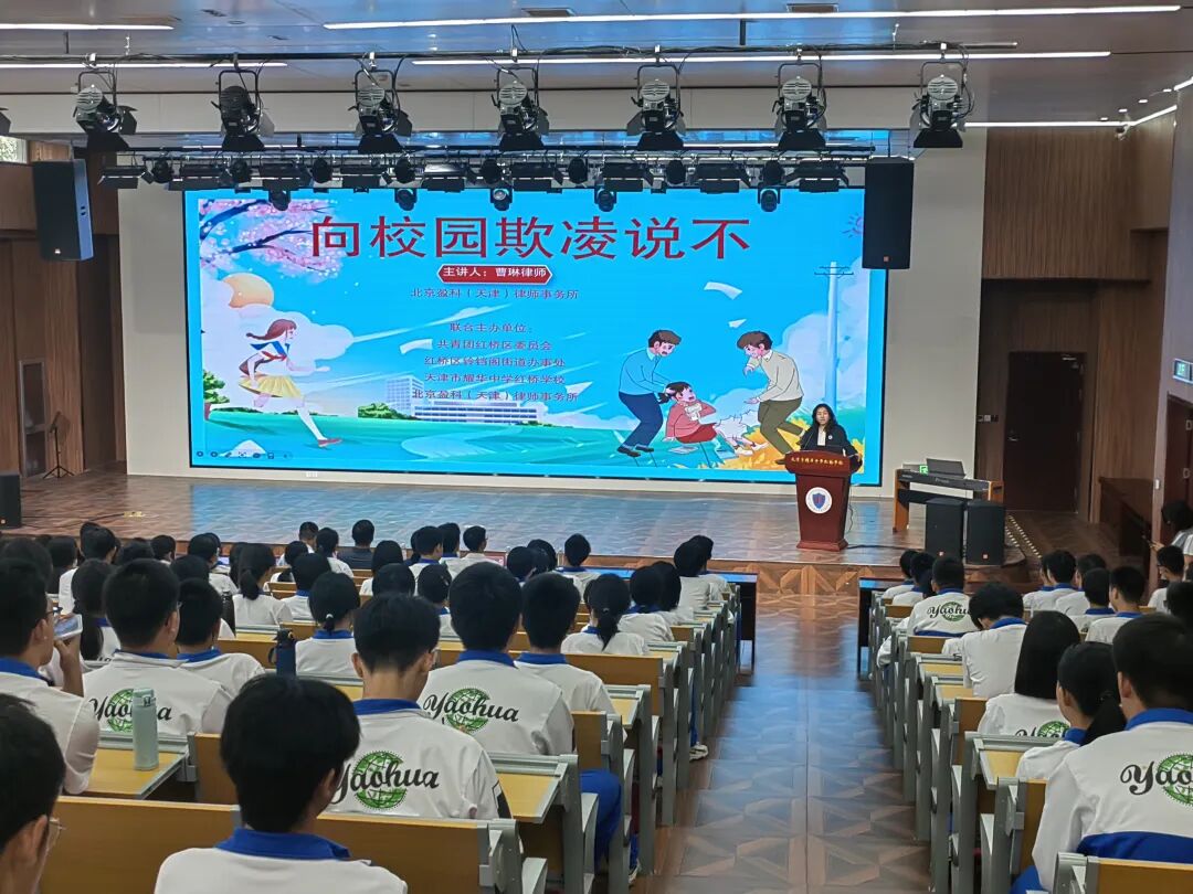 为筑牢校园安全防线,守护青少年身心健康,近日,团区委联合铃铛阁街道、北京盈科(天津)律师事务所、天津市耀华中学红桥学校,开展“向校园霸凌说不”主题普法讲座,以法治力量助力青少年远离欺凌、阳光成长。