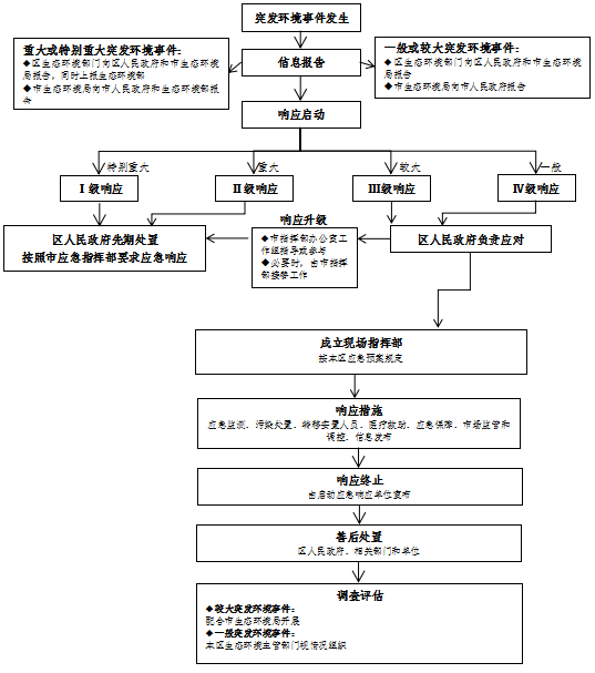 初判属于较大、一般突发环境事件,需要分别启动Ⅲ级、Ⅳ级响应,由区人民政府负责应对工作。当发生超出本区应急处置能力时,根据实际工作的需要,区人民政府申请市指挥部办公室派出工作组指导、参与应对处置工作。